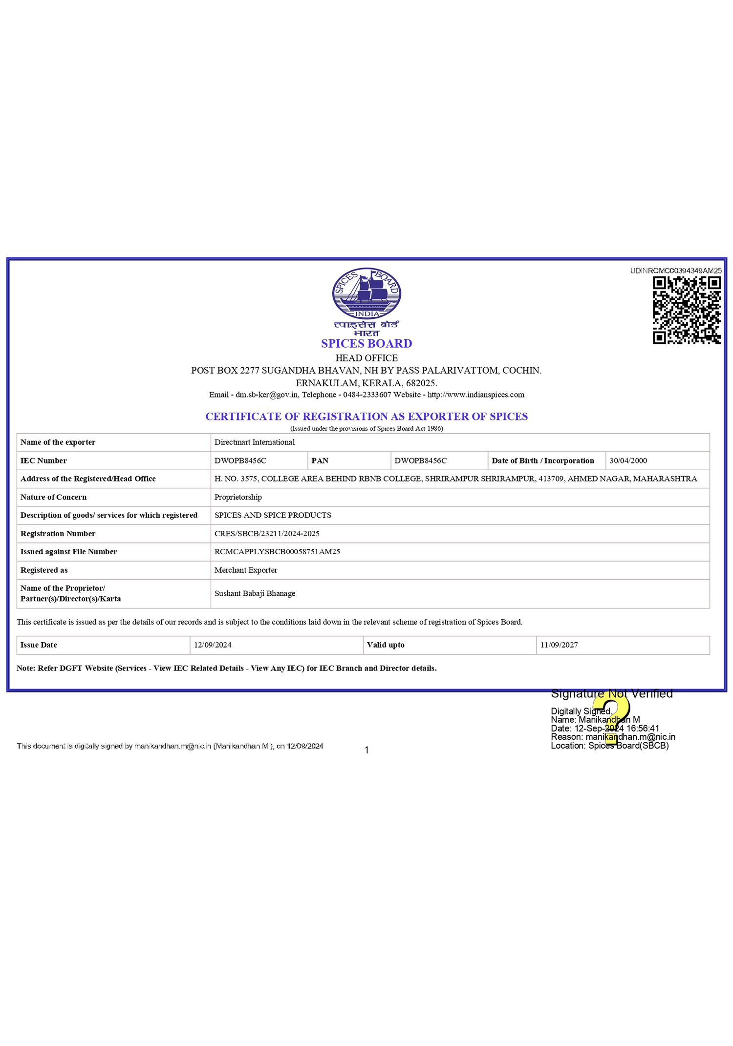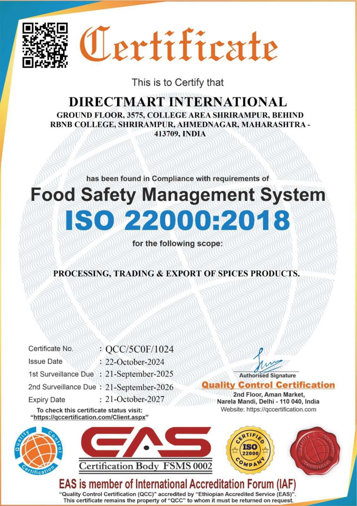 This is to certify that the products offered by DirectMart International meet the highest standards of quality and authenticity. Each spice sourced from the heart of India is carefully handpicked from the finest farms, ensuring that only the purest, most flavorful ingredients reach our customers. Our commitment to excellence guarantees that every product we deliver carries the true essence of India’s rich spice-growing heritage. Through our rigorous inspection process, we ensure that each spice is carefully packaged to preserve its natural flavors, aroma, and potency. With pride, we present this certificate as a mark of quality and trust, showcasing our dedication to delivering the finest, most authentic spices to businesses worldwide. We are honored to share the vibrant flavors and traditions of India with you, bridging cultures through the timeless magic of spices.