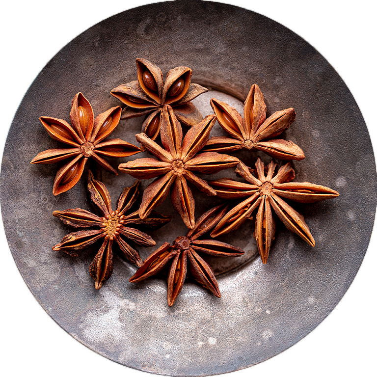 Star anise is a star-shaped spice derived from the fruit of Illicium verum, a tree native to China and Vietnam. It is widely used in Asian cuisine, especially in Chinese five-spice powder, broths, and teas, as well as in baking and liqueurs.